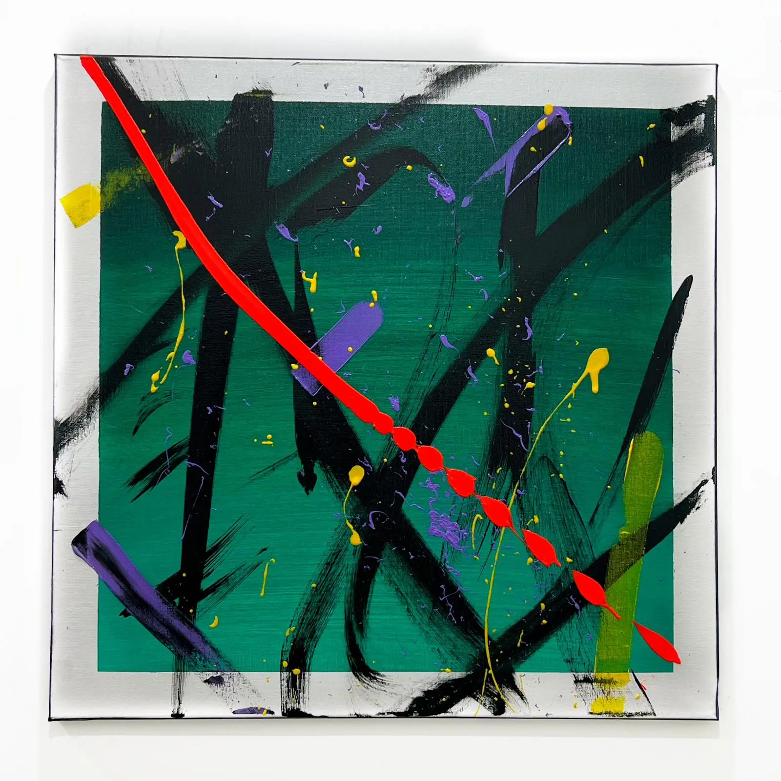 – Green Park è un’esplosione di luce e vitalità, un angolo di mondo dove la natura incontra la gioia dell’infanzia. Toni intensi di verde si intrecciano tra loro, pennellate dinamiche che richiamano il fruscio delle foglie mosse dal vento. Macchie di colore acceso – arancio, viola e giallo – emergono come accenti di energia e spensieratezza, portando calore e movimento all’opera.